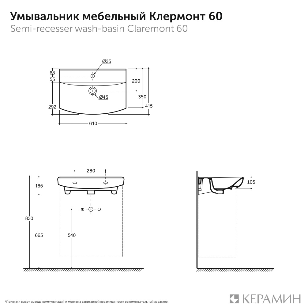 Умывальник Клермонт 60 мебельный с/о с креплением белый с1